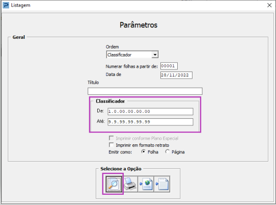 3- Para emissão deverá informar no campo classificador o grupo da conta que apresenta erro no Validador.