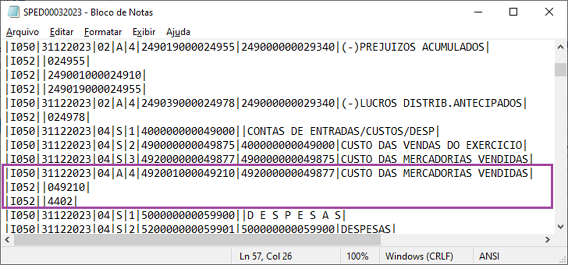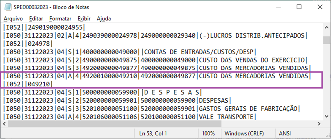 Após a geração, identificará que no arquivo texto gerou o código aglutinador na conta de Transferência de estoque "49210" e não sobre a conta de Acesso que pertence ao grupo do "Ativo”