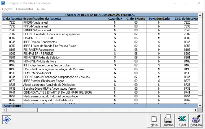 Acesse: Parâmetros Gerais > Tabelas Oficiais > Tabelas Federais > Código de Receita de Arrecadação