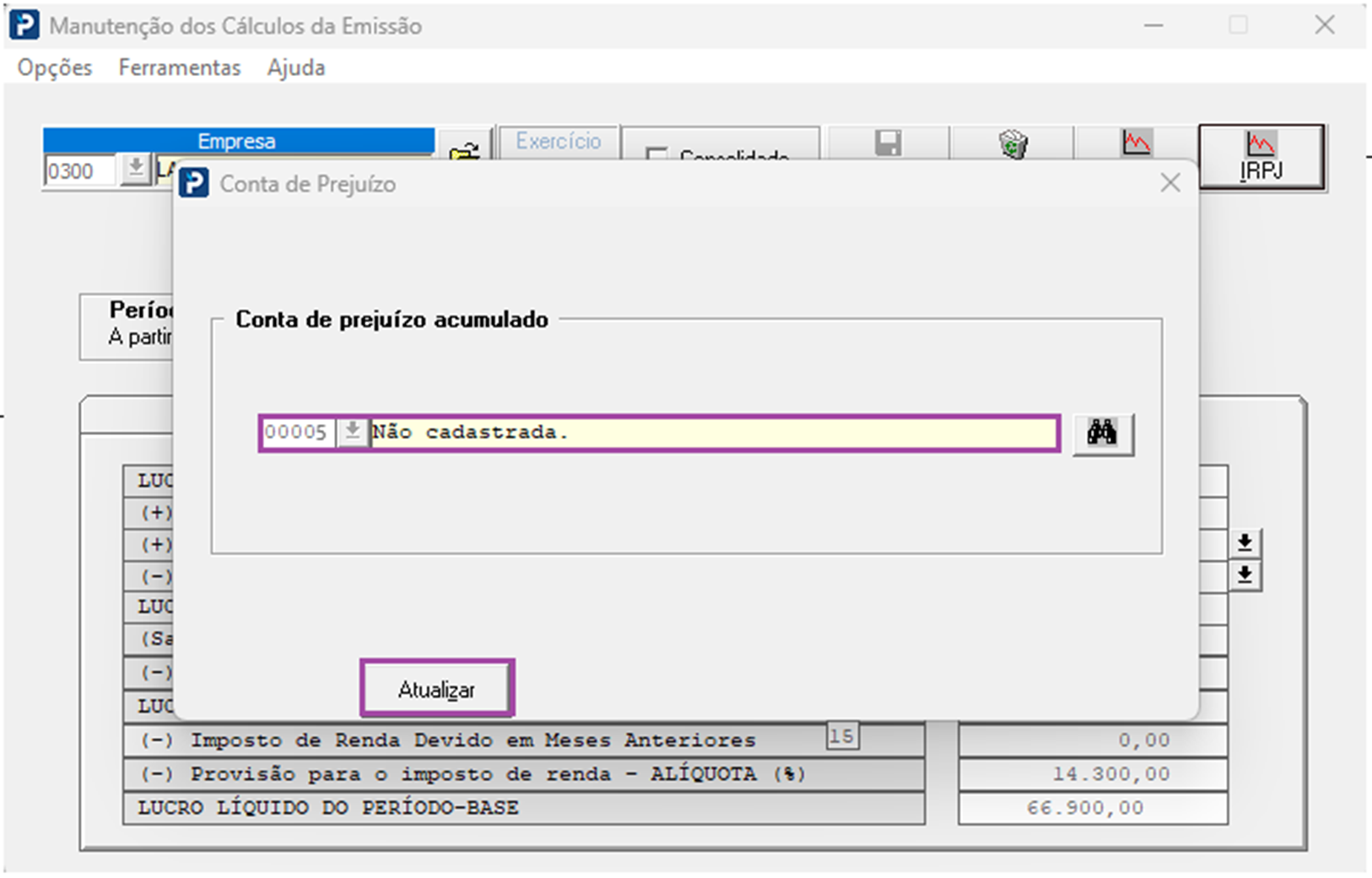 - Verifique a conta informada na Manutenção de Cálculos da Emissão após o processamento esta como não cadastrada.