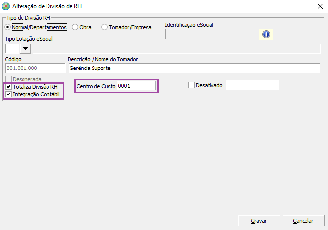 2- Crie a Divisão de RH, habilitando a opção Integração Contábil, Totalizar Divisão de RH e informar o Centro de Custo.