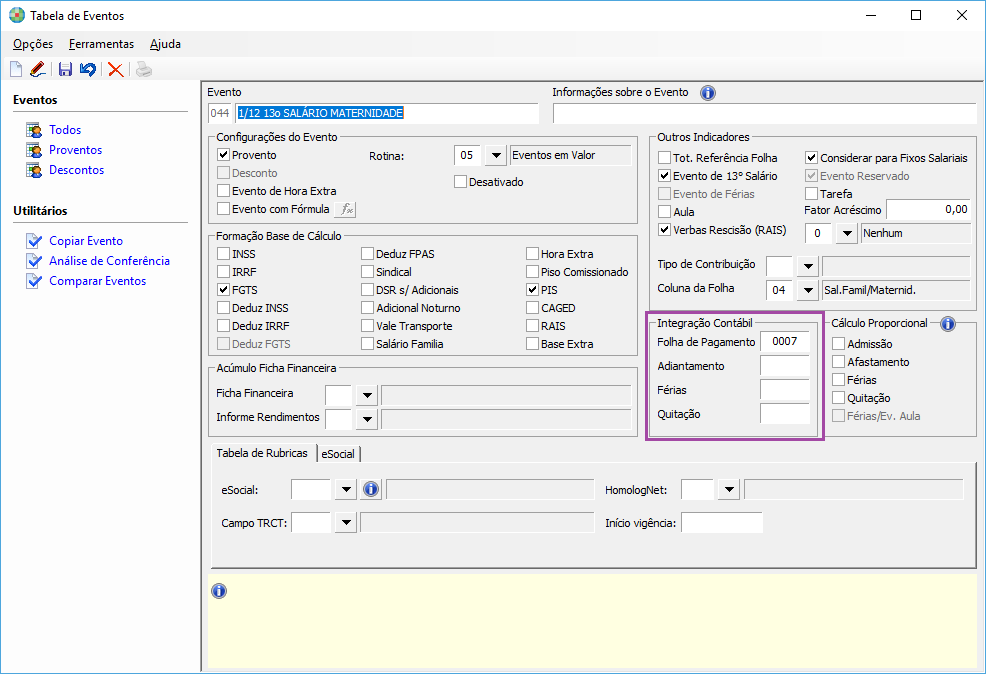2- No(s) evento(s) que deseja integrar para a contabilidade digite o CLI no campo Integração Integração Contábil.