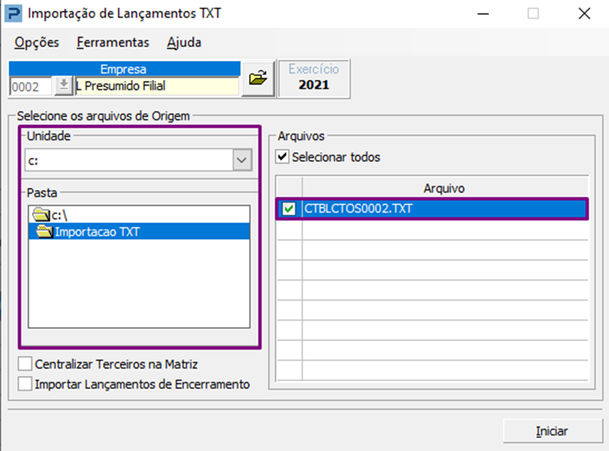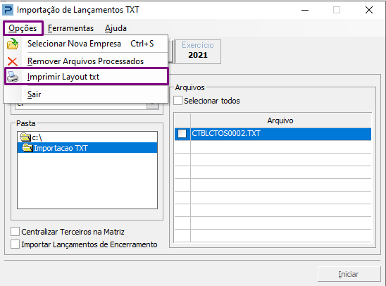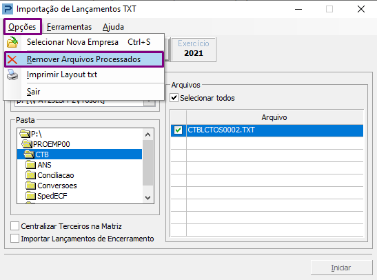 - Arquivos: Deve-se marcar o arquivo desejado para importação. Somente serão apresentados os arquivos se estiverem com o nome mencionado no leiaute como CTBLCTOSeeee.TXT (onde "eeee" refere-se ao número da empresa a ser importada)