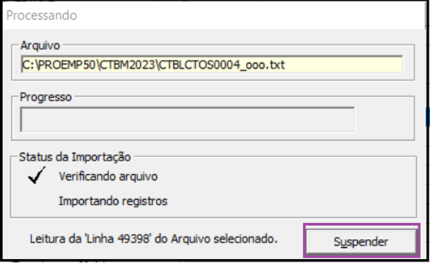 3- Durante a verificação do arquivo, será exibida uma tela de processamento demonstrando o andamento da importação, nela também demonstrará o número da linha que está sendo processada, pois em caso de erro no processo de importação, possa ser identificada a linha do arquivo que está sendo lida e importada. Ao clicar sobre o botão “Suspender”, o processamento será cancelado.