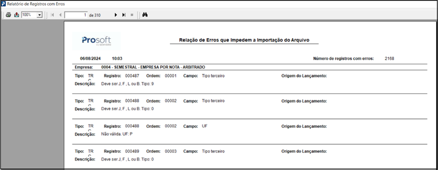 4- Após a sua execução, caso sejam encontrados erros, a importação não será efetuada, mas será apresentada a “Relação de Erros que Impedem a Importação” (que pode ser visualizada em tela ou impressa), detalhando os dados do tipo do registro, o campo em que se encontra o erro e a descrição do mesmo, para que seja corrigido posteriormente