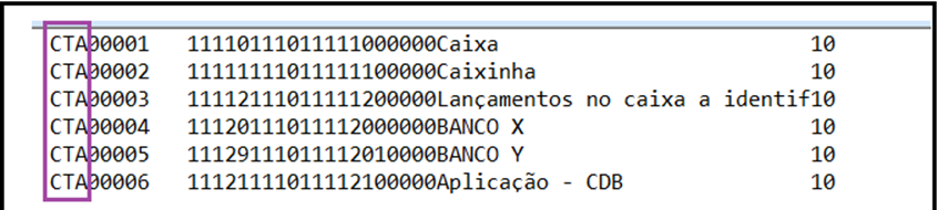 Observação: O registro CTA deve ser incluso no arquivo antes dos registros dos tipos LC1 e LC2 correspondentes, caso contrário, a conta não poderá ser criada.