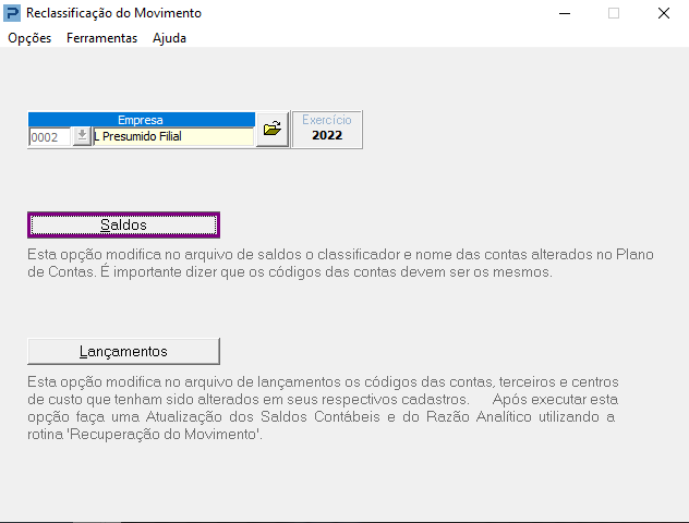 2- Após criar a conta Ativo e gravar, é necessário realizar a Reclassificação do Movimento, na opção Saldos.