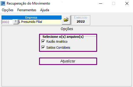 2- Realize a Recuperação do Movimento, habilitando as opções Razão Analítico e Saldos Contábeis.