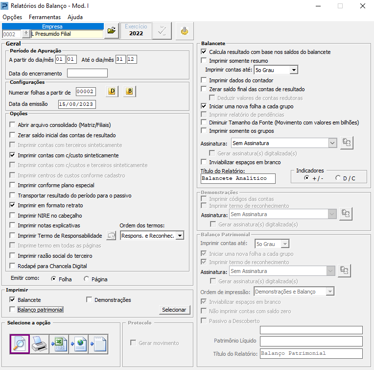 1- Acesse: Contábil > Contabilidade > Encerramento > Relatórios > Relatório do Balanço Mod. I ou II