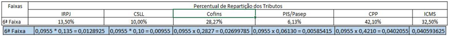 Como a 6ª faixa não possui percentual de distribuição do ICMS, este deve ser calculado com base na 5ª faixa.