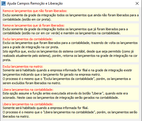 É importante ressaltar também que, quando realizada a exclusão dos lançamentos pela opção Remover lançamentos que já foram Liberados, o sistema perderá a referência dos lançamentos, possibilitando que o usuário gere uma nova integração, porém, caso o mesmo tente realizar a liberação para a contabilidade novamente, poderá ocasionar em duplicidade e valores indevidos na movimentação.