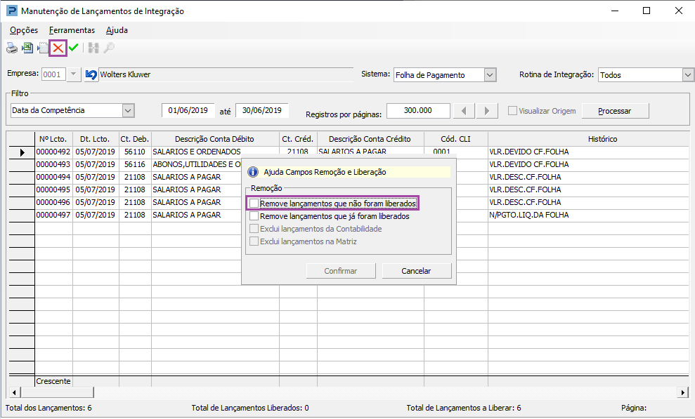 8- Para excluir também os lançamentos gerados na integração, selecione a opção Remove lançamentos que não foram liberados e clique no botão Confirmar.