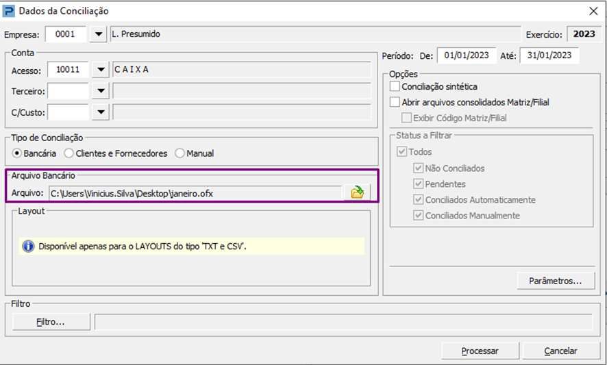 2- Selecione o arquivo que deseja importar no campo Arquivo Bancário e clique em Parâmetros.
