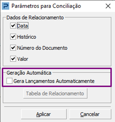 3- Na opção Parâmetros para Conciliação, deixe a opção 'Gera Lançamentos Automaticamente' desabilitada.