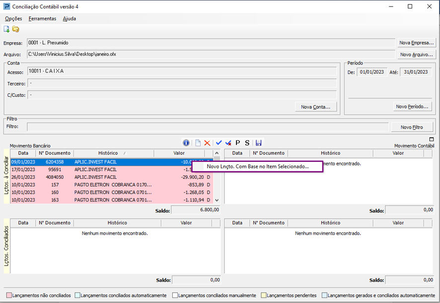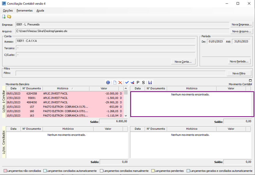 4- Ao processar a Conciliação Contábil o Movimento Bancário é apresentado, porém não existe o Movimento Contábil.