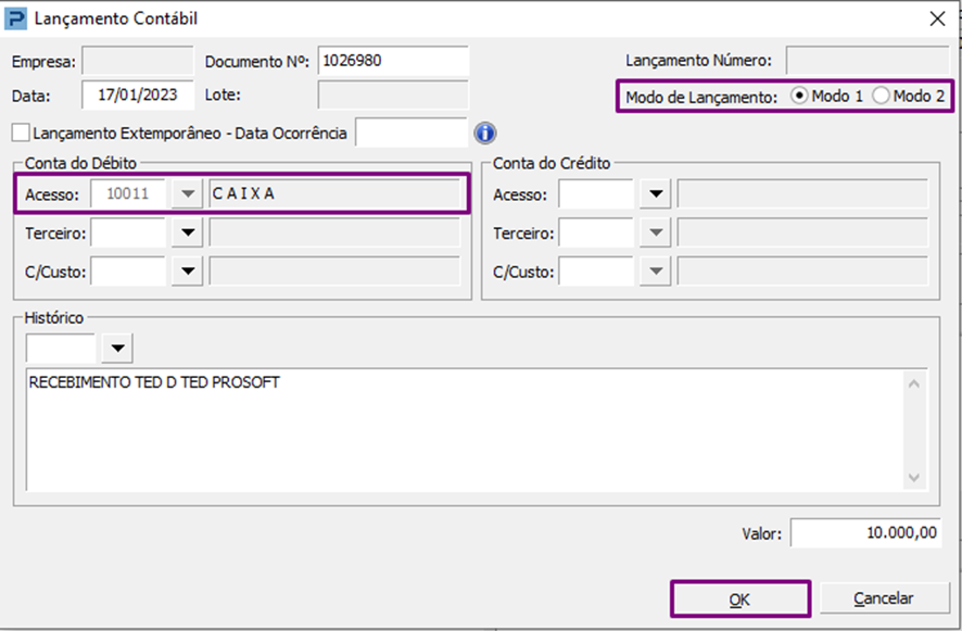 7- Preencha o Modo de lançamento a ser gerado (Modo 1 ou Modo 2), selecione a Conta Débito do lançamento e clique em Ok.