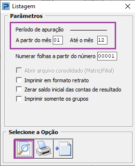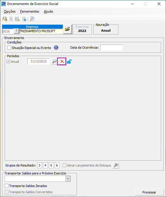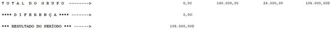 Na última página do relatório, são apresentadas as linhas Diferença e Resultado do Período. Se o encerramento do exercício social já estiver processado, nenhuma das duas linhas poderão conter valores.