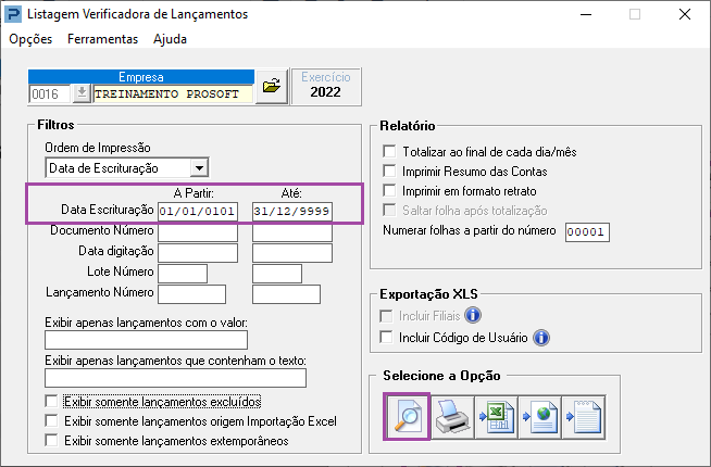Importante: O campo Data de Escrituração deve ser preenchido com uma data discrepante, em função de erros de digitação, desta forma, a busca conseguirá identificar lançamentos fora do exercício.