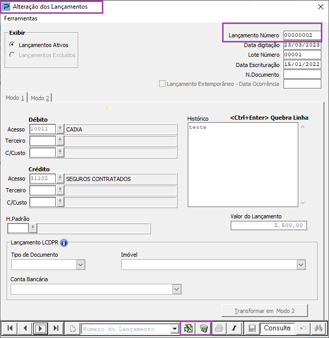 3- Informe o número do lançamento no campo Lançamento Número e clique em excluir ou alterar.