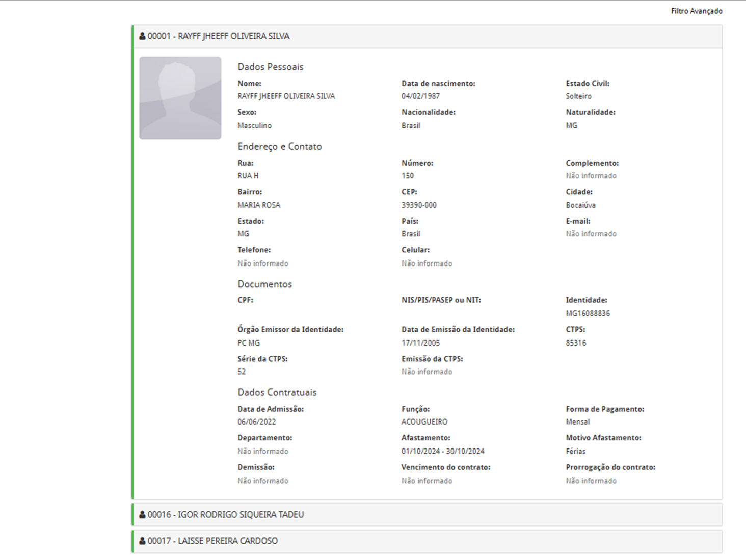 Para visualizar as informações dos funcionários basta o usuário clicar sobre o nome do mesmo e as informações cadastrais integradas serão apresentadas