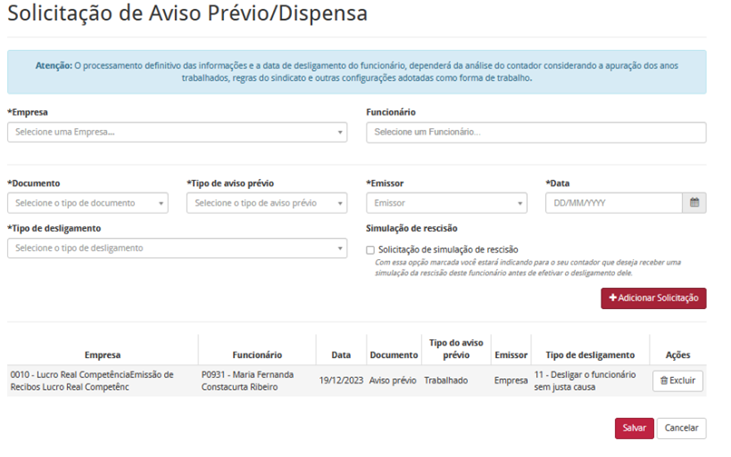 Após o preenchimento pressionar o botão "Adicionar Solicitação "quando finalizar todas as inclusões pressionar o botão "Salvar" para que a solicitação fique disponível para a importação da Folha de Pagamento.