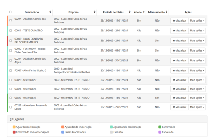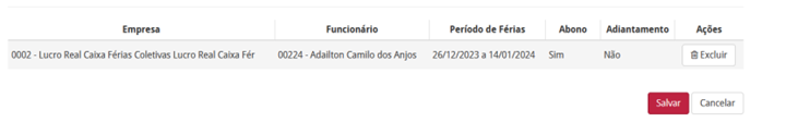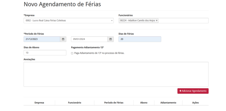 Com as previsões apresentadas para todos os funcionários da empresa será apresentado à frente de cada o botão que irá permitir ao usuário realizar a solicitação de um agendamento das férias para o funcionário em um determinado período que será tratado no item Agendamento de Férias. Observe o agendamento abaixo onde foi informado para a empresa “0002” o funcionário “00224”