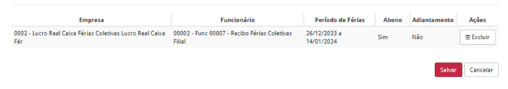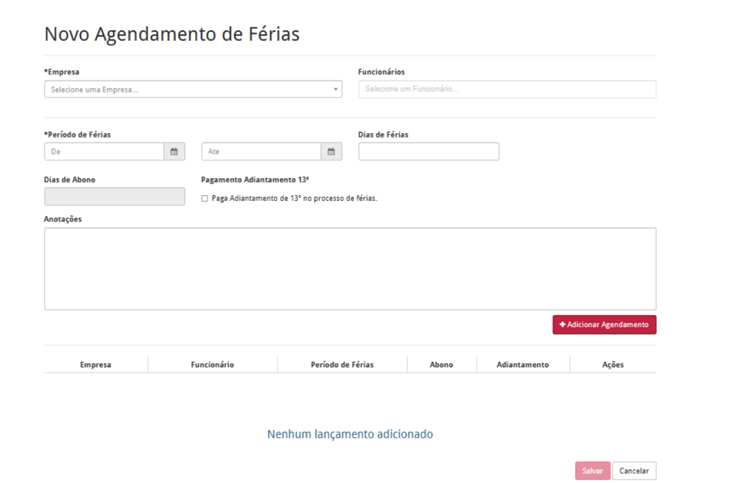 Nesta tela o usuário deverá indicar a empresa, na sequência selecionar o funcionário e indicar o período de Férias para o mesmo. Caso o usuário informe um período de férias inferior a 30 dias é apresentada uma mensagem solicitando se os dias restantes serão pagos como abono pecuniário.