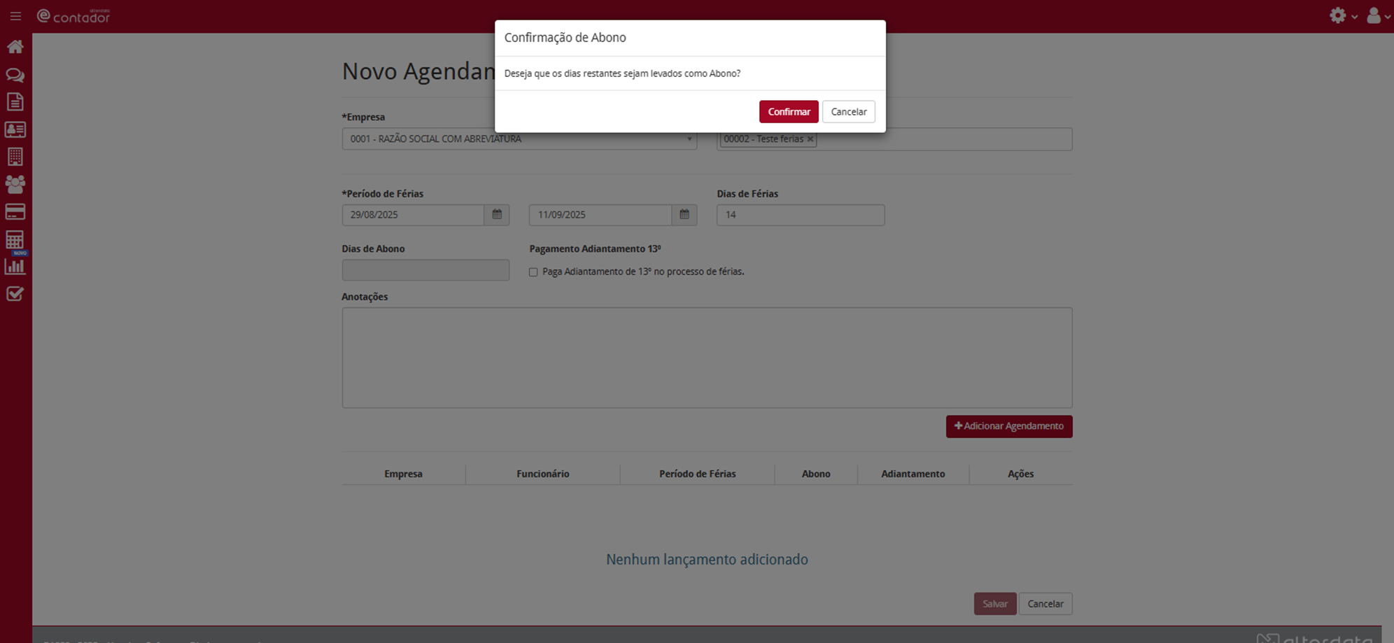 Caso pressione o botão "Confirmar " o campo Dias de Abono será preenchido.Caso pressione o botão "Cancelar" O campo Dias de Abono fica vazio - O cliente pode também solicitar o pagamento do adiantamento de 13º salário nas férias.