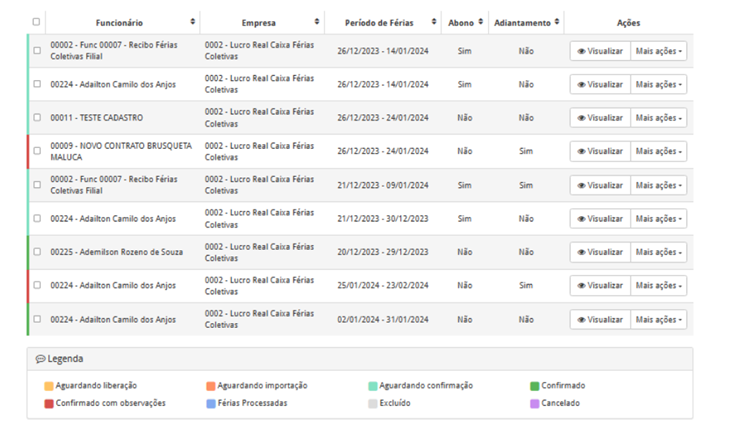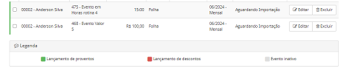 Para identificar se o tipo do evento é “Proventos” ou “Desconto” ou se é um evento inativado existe a legenda de cores.