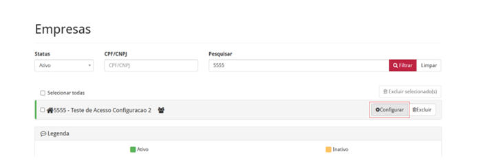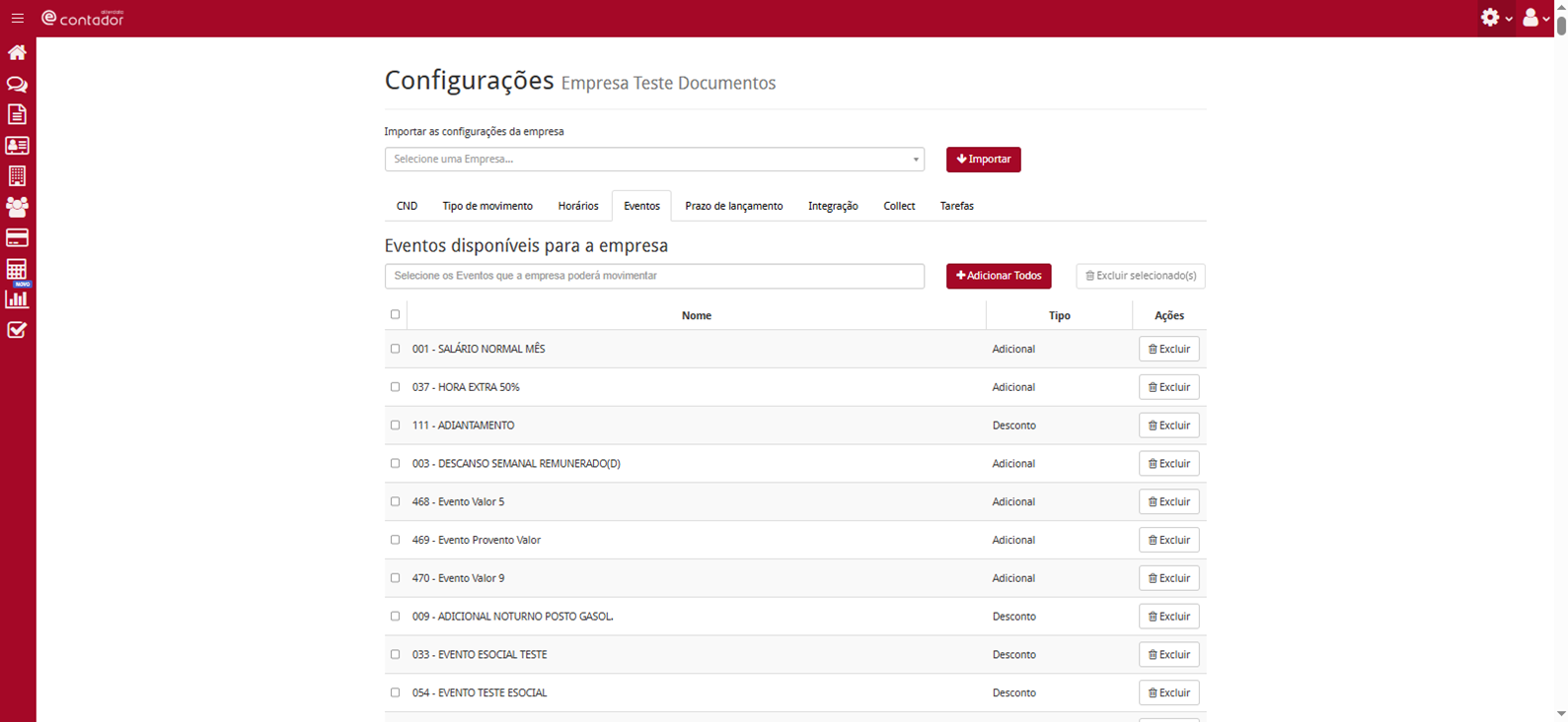 Para realizar a exclusão de um evento já habilitado para a empresa selecione o evento e na sequência, pressione o botão excluir para um único evento ou o botão Excluir selecionado(s) para excluir todos os eventos selecionados.