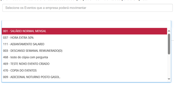 Neste momento selecionar o evento que será utilizado pela empresa clicando no campo selecione para mostrar a lista de eventos cadastrados que podem ser habilitados para a empresa.