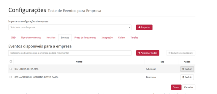 No exemplo acima para a empresa 5555 Teste de Eventos para Empresa está sendo habilitado os eventos 037 e 009.