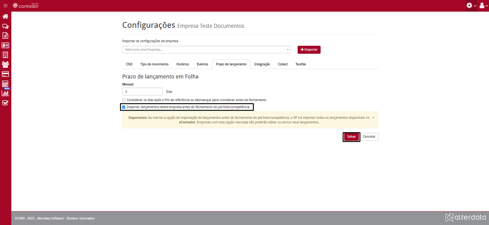 do período/competência”, o mesmo fica em: Empresas > Configurar > Prazo de Lançamento , com a opção selecionada. Sempre que solicitado pela folha os eventos do eContador serão importados:
