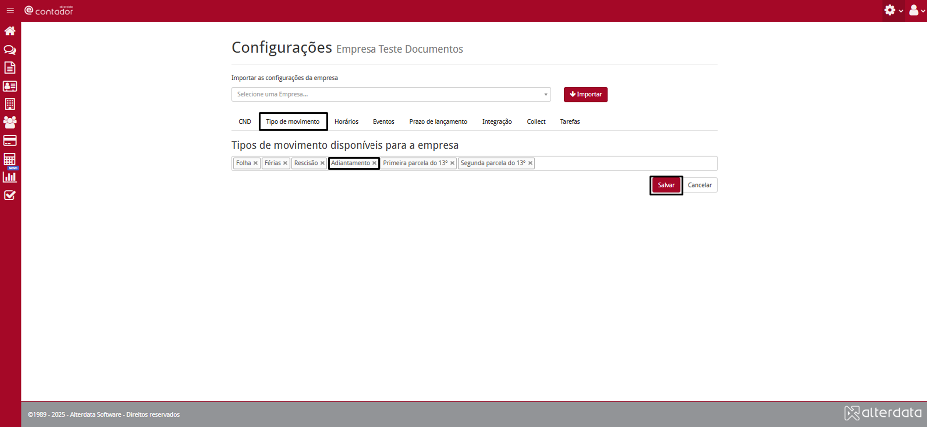 2 - Podemos também indicar quais os tipos de movimentos a empresa irá enviar para a Folha de Pagamento, isso é feito no Portal eContador, na aba Tipo de Movimento e no campo: Tipos de movimento disponíveis para que a empresa, onde temos os tipos abaixo, permitidos no Portal eContador:
