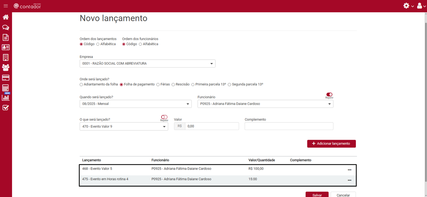 No exemplo acima foi selecionado o funcionário 00004 para lançamento no evento 468.