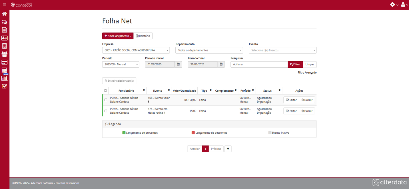 Na tela a seguir foi após pressionado o botão “SALVAR” foi realizada uma pesquisa na competência 08/2025 para a funcionária “Adriana” apresentando os valores que foram salvos aguardando a sua importação.