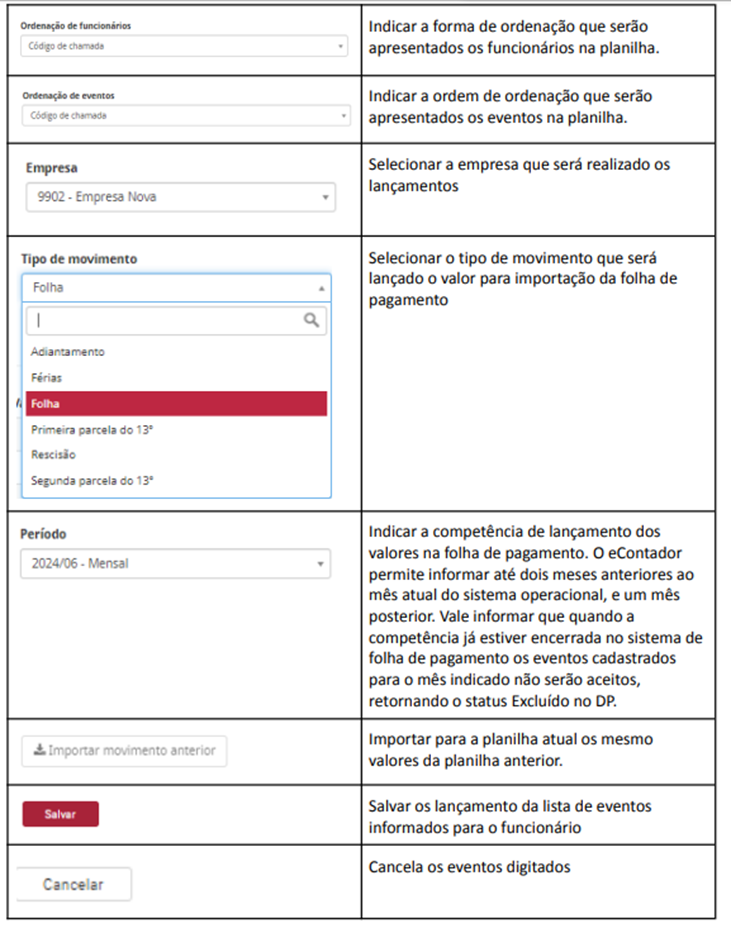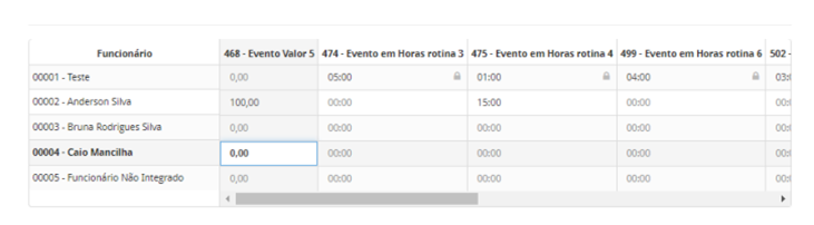 Ao selecionar a empresa, o tipo de movimento e o período será apresentada uma planilha com todos os funcionários ativos e todos os eventos habilitados que podem receber lançamentos.