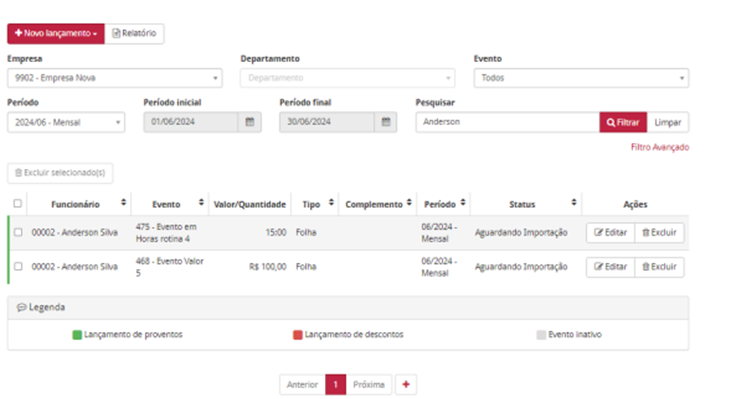 Na tela acima todos os eventos são de Lançamentos de Proventos.