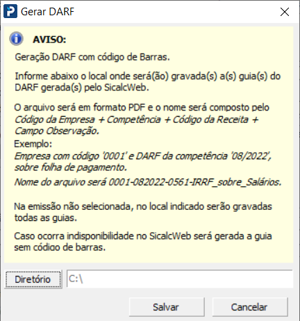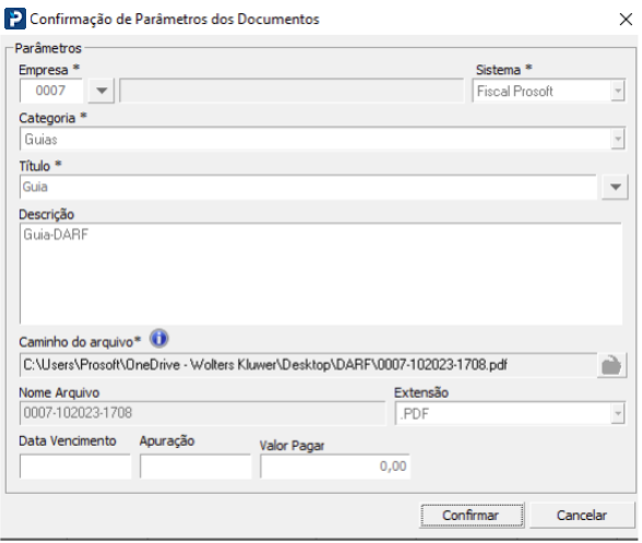 Após gerar a DARF com Códigos de barras, apontar o Diretório onde a DARF será salva, ao concluir, será aberta a tela para confirmação dos dados a partir da qual será possível visualizar como o relatório será integrado com o eContador Documentos.
