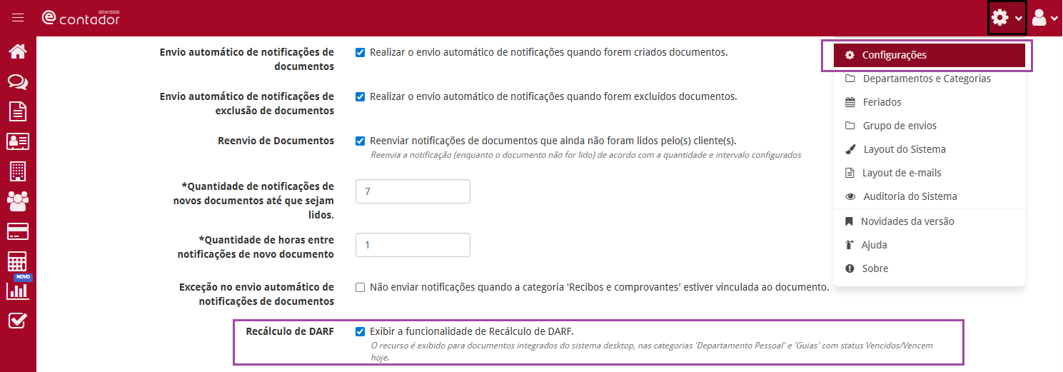 - Em seguida, no campo Documentos, marque a opção Exibir a funcionalidade de Recálculo de DARF;