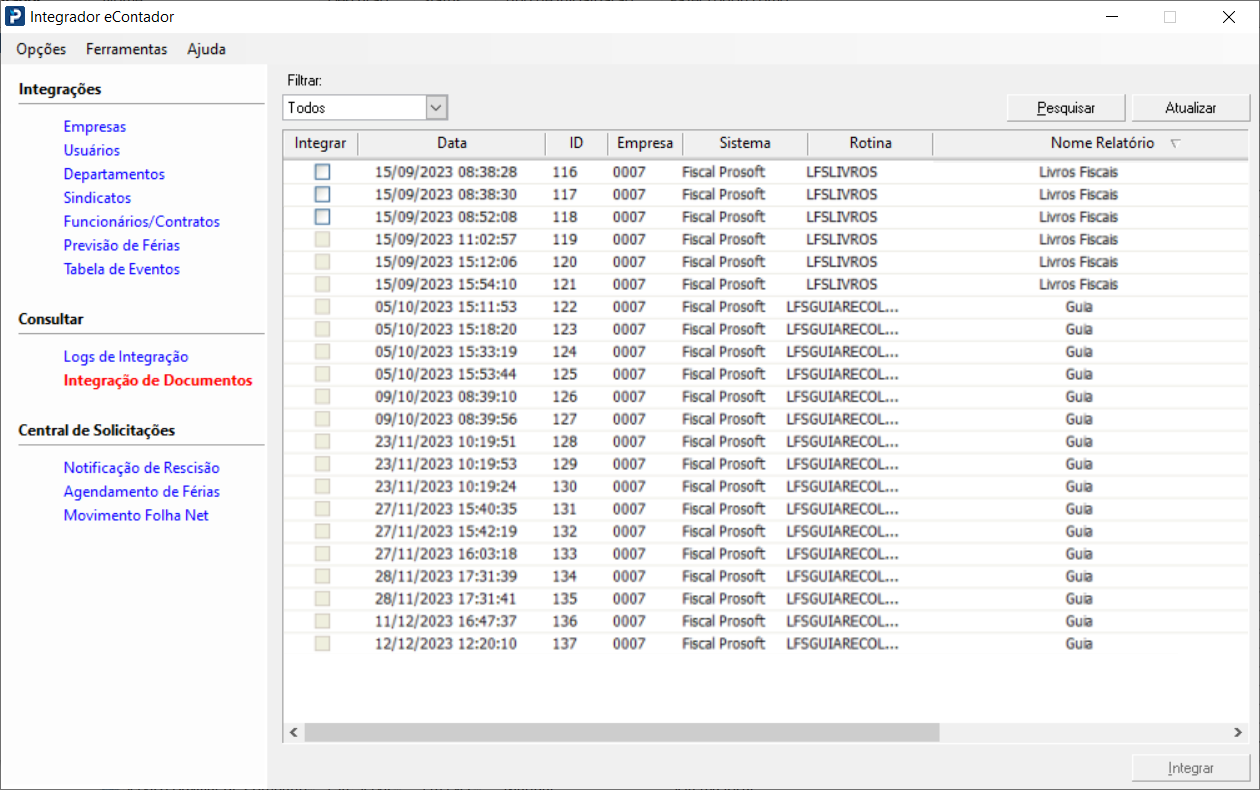 2- Após realizar a integração será possível visualizar seu status na rotina Integrador eContador em Parâmetros Gerais.