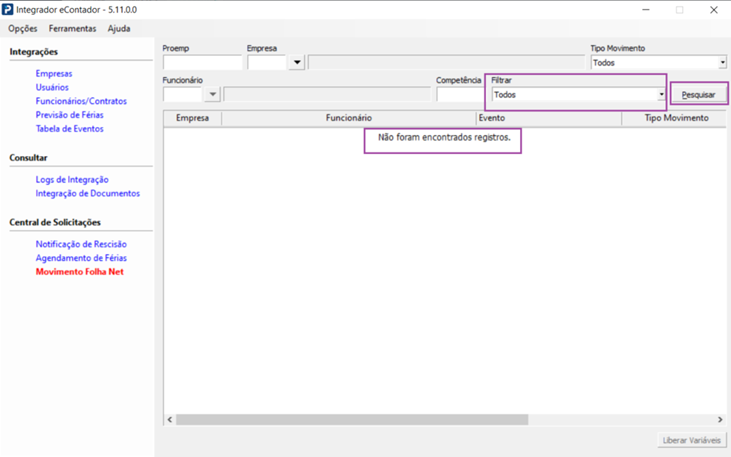 Com isso, na rotina Integrador eContador - Movimento Folha Net, não aparece nenhum movimento: