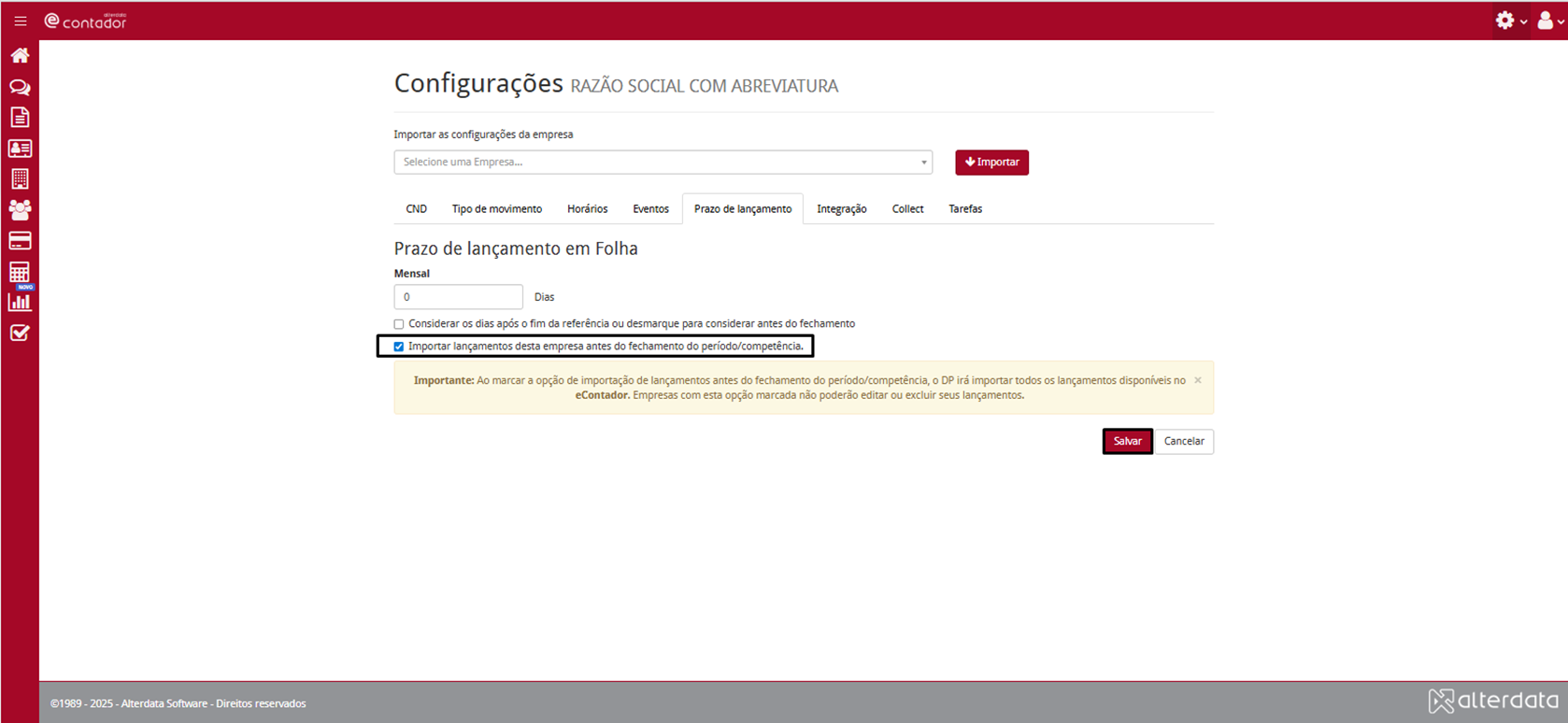 Marque a opção: Importar lançamentos desta empresa antes do fechamento do período/competência.