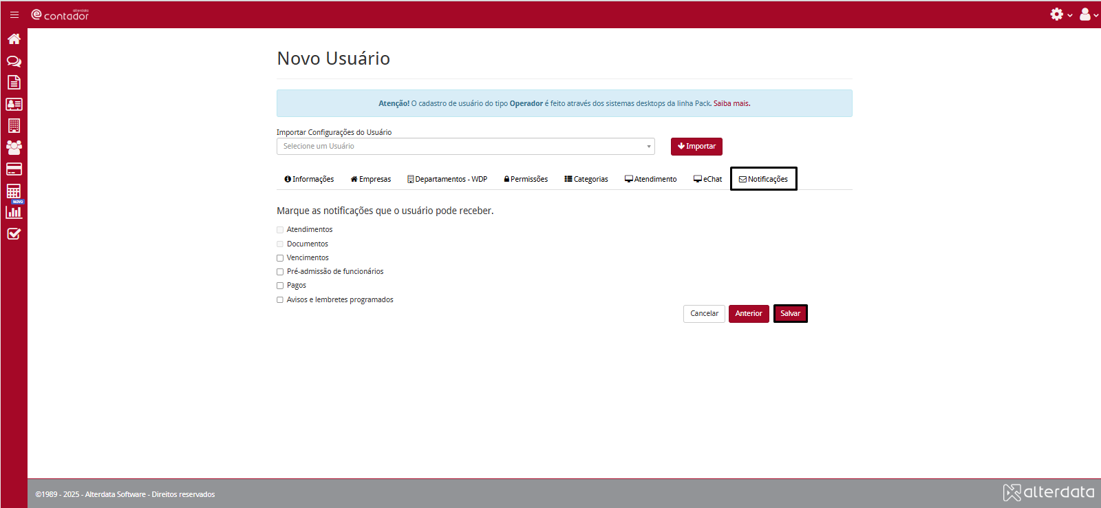 > Na aba Notificações: marque as notificações permitidas para que este usuário receba.Após concluir o cadastro, clique em Salvar.