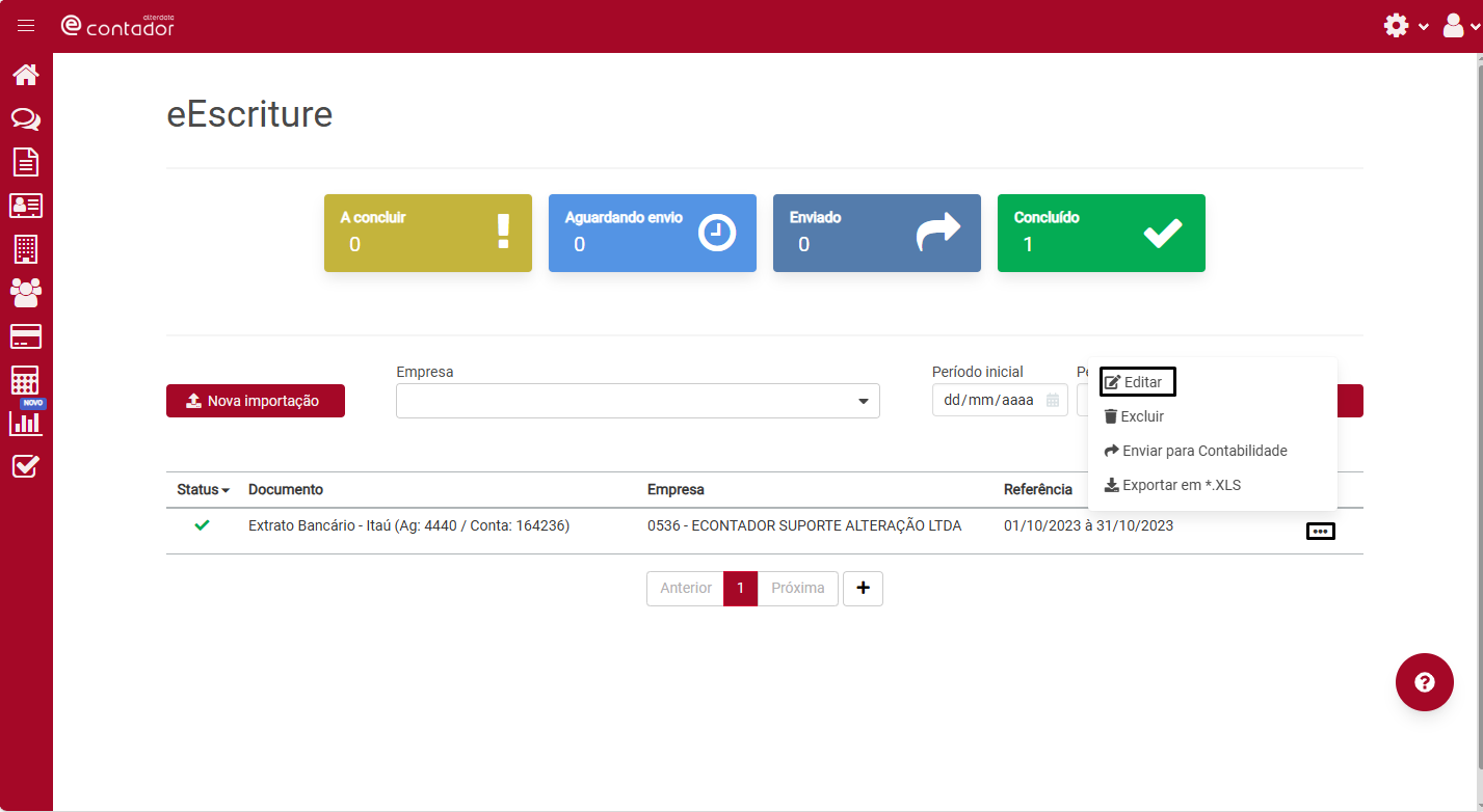 1-Clique na aba Contabilidade - eEscriture > Selecione o extrato desejado e clique em Editar;