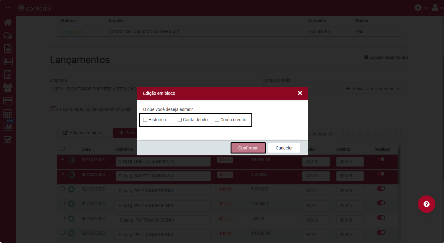3-Na tela Edição em Bloco, selecione Histórico, Conta débito e/ou Conta Crédito e informe as alterações desejadas; Clique em Confirmar.