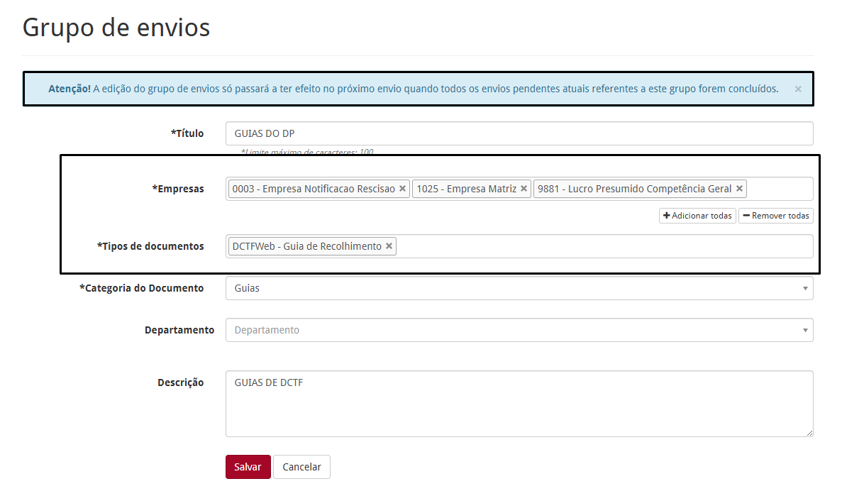 Temos a opção de Editar um grupo de envios, porém só é possível editar alguns campos caso o grupo não esteja aberto, o grupo está aberto quando há algum pré-documento referente àquele grupo em Documento gerais. Caso tenha, ao clicar em editar teremos uma mensagem de aviso e alguns campos bloqueados: