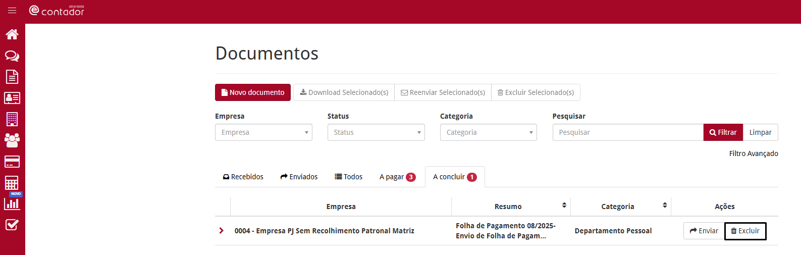 Após fazer o cadastro do grupo seguimos para os envios dos documentos que configuramos no grupo de envios. Enquanto enviamos os documentos que compõem o grupo, enquanto não forem enviados todos, o grupo ficará disponível no módulo de documentos gerais aba a concluir e será possível ir acompanhando os documentos que faltam para fechar o grupo. Documentos enviados ficarão com status concluído e documentos que ainda não foram enviados ficarão com status pendente.