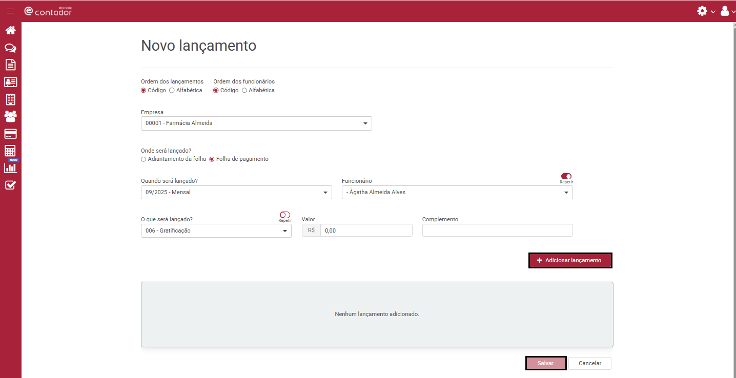 Na tela Novo Lançamento será necessário informar o tipo de processo, o período, o evento que deseja lançar, o funcionário e o Valor/Quantidade a ser considerada. Após informar os dados clique em Adicionar Lançamento e salvar.