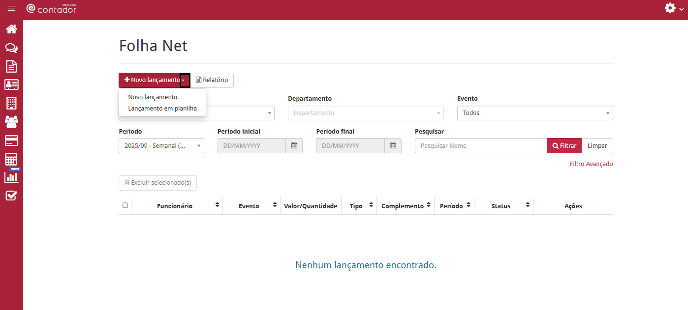 Na tela de lançamentos do Folha Net selecione a empresa e clique na opção Novo Lançamento